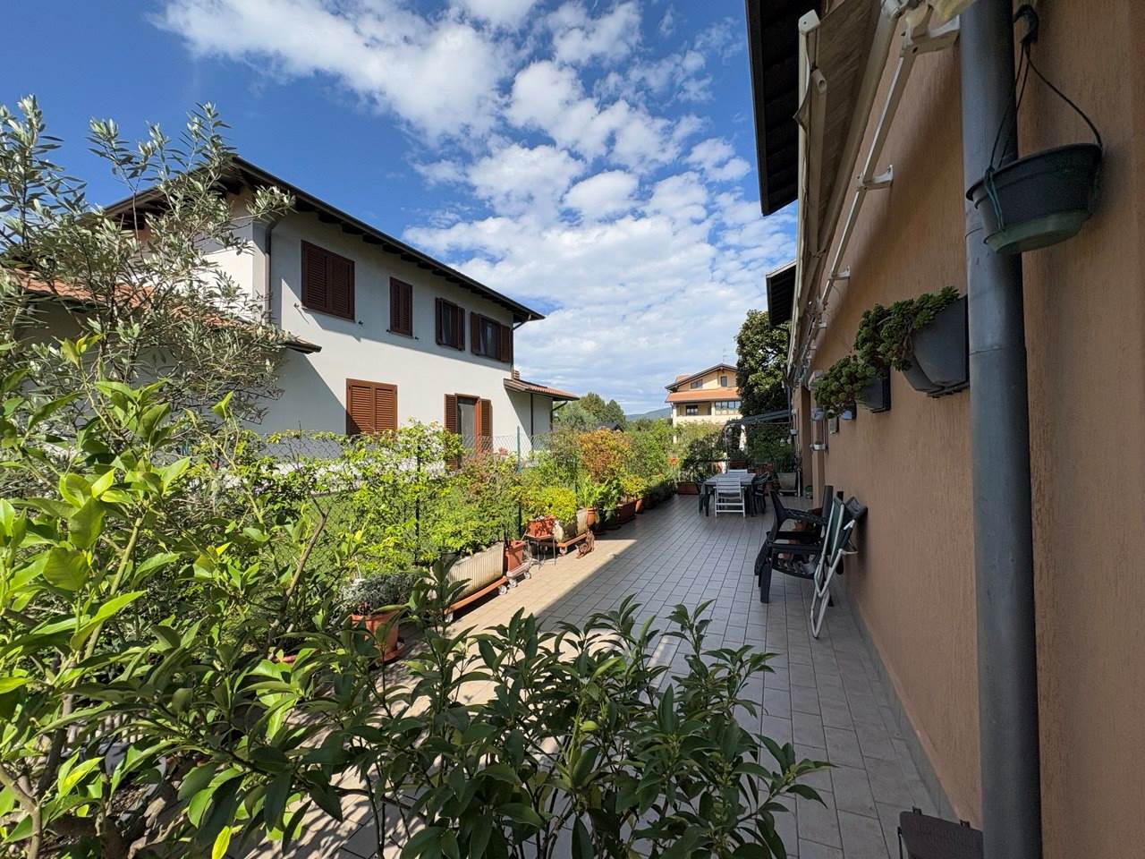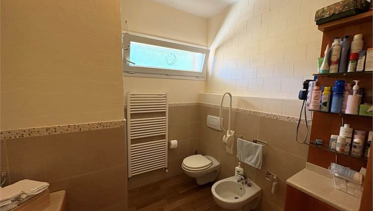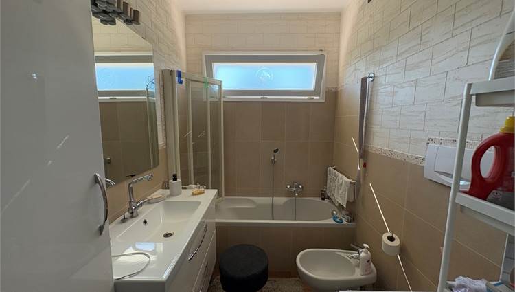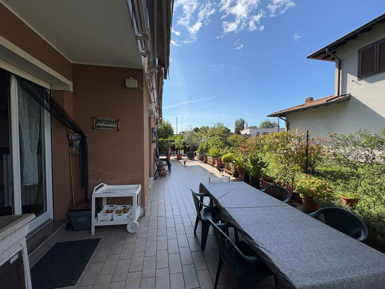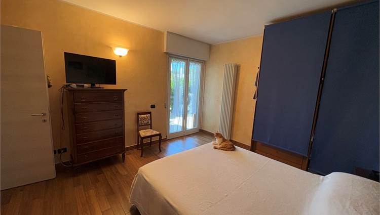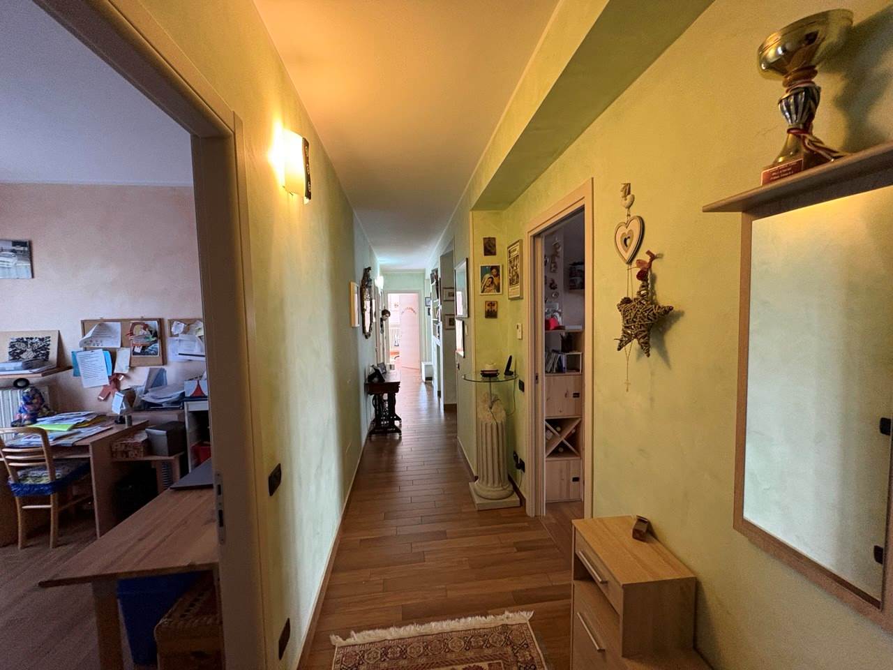 L'appartamento posto al piano terra è grande 156mq ed è composto da ingresso, lungo corridoio che collega la cucina abitabile, l'ampio soggiorno, lo studio, 5 camere, 2 bagni, e un ampio terrazzo di 67mq.